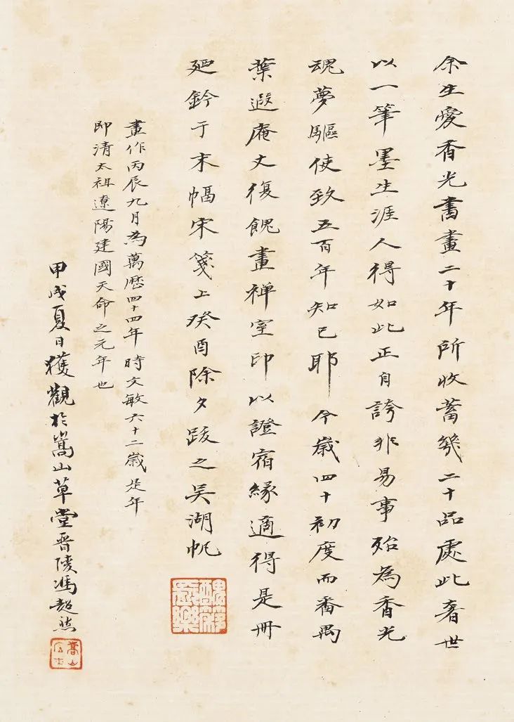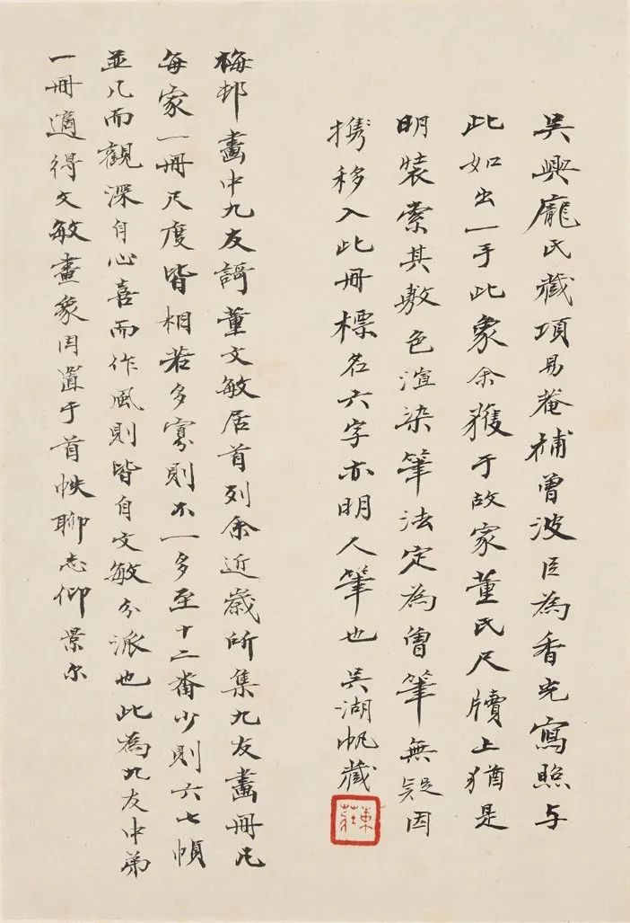 余生爱香光字画,二十年所收蓄几二十品。处此奢世,以一文字生计东说念主得如斯,正自爱非易事。殆为香光魂梦驱使,致五百年心腹耶!今岁四十初次,而番禺叶遐庵(叶恭绰)丈复馈“画禅室”印,以证宿缘。适得是册,乃钤于末幅宋笺上。癸酉(1933)除夕跋之。吴湖帆。