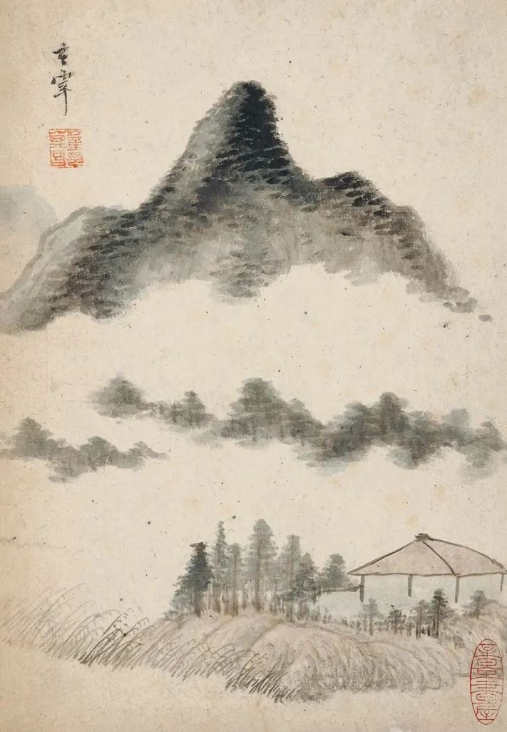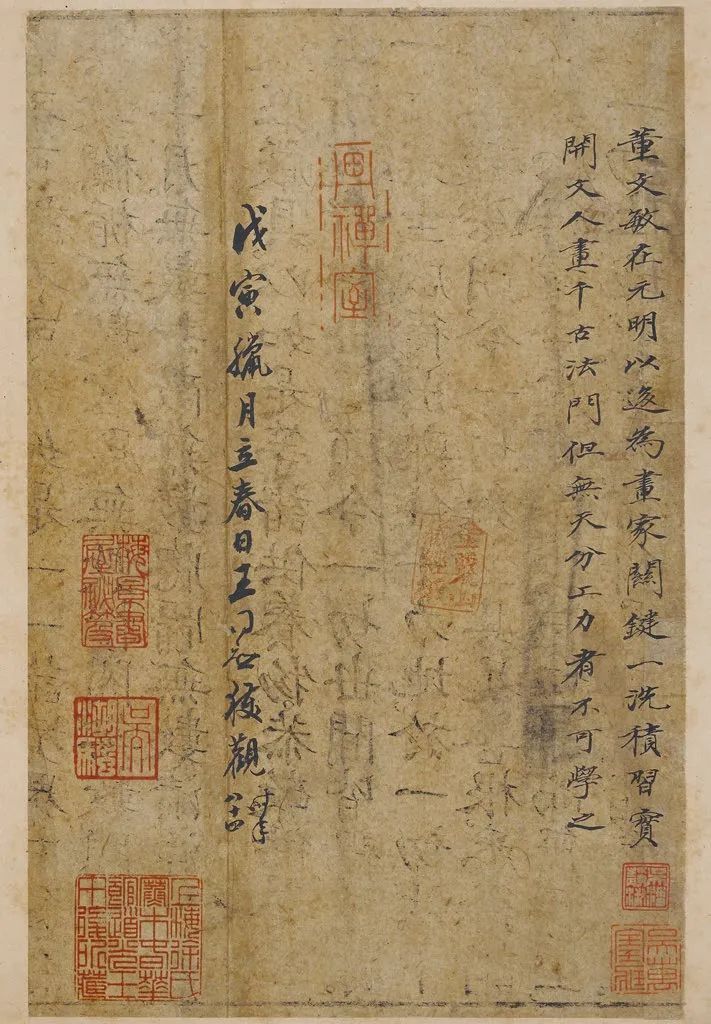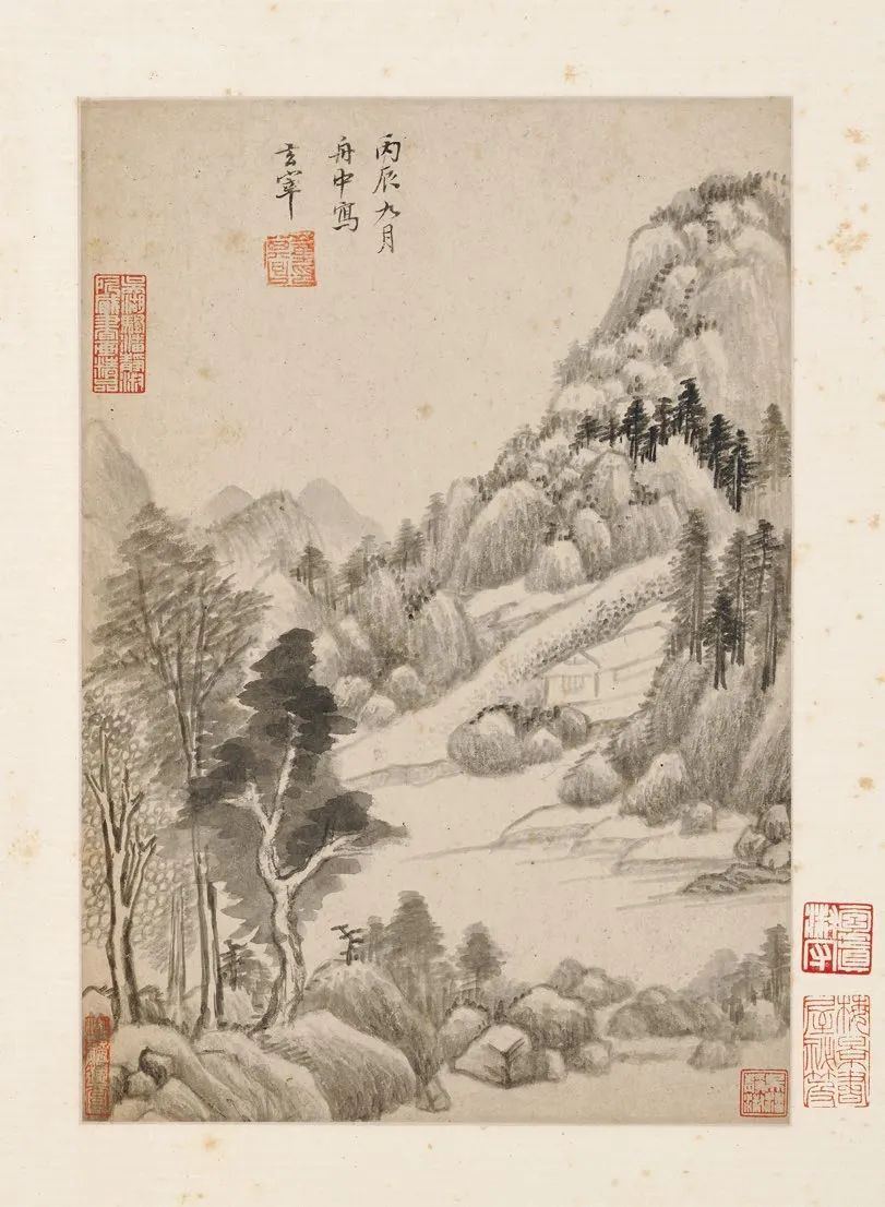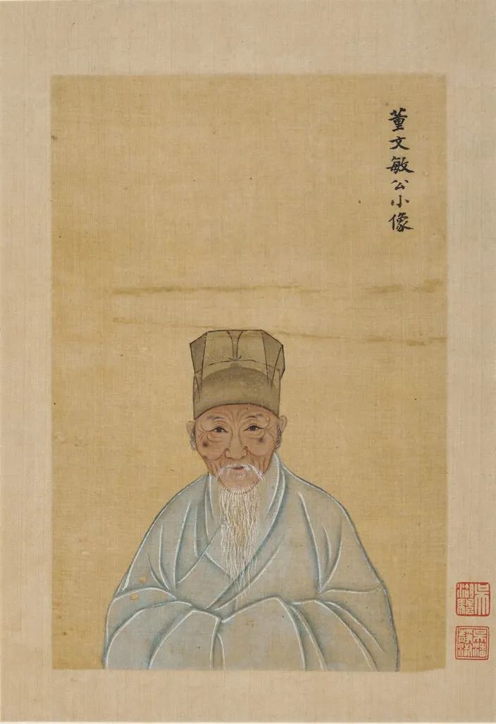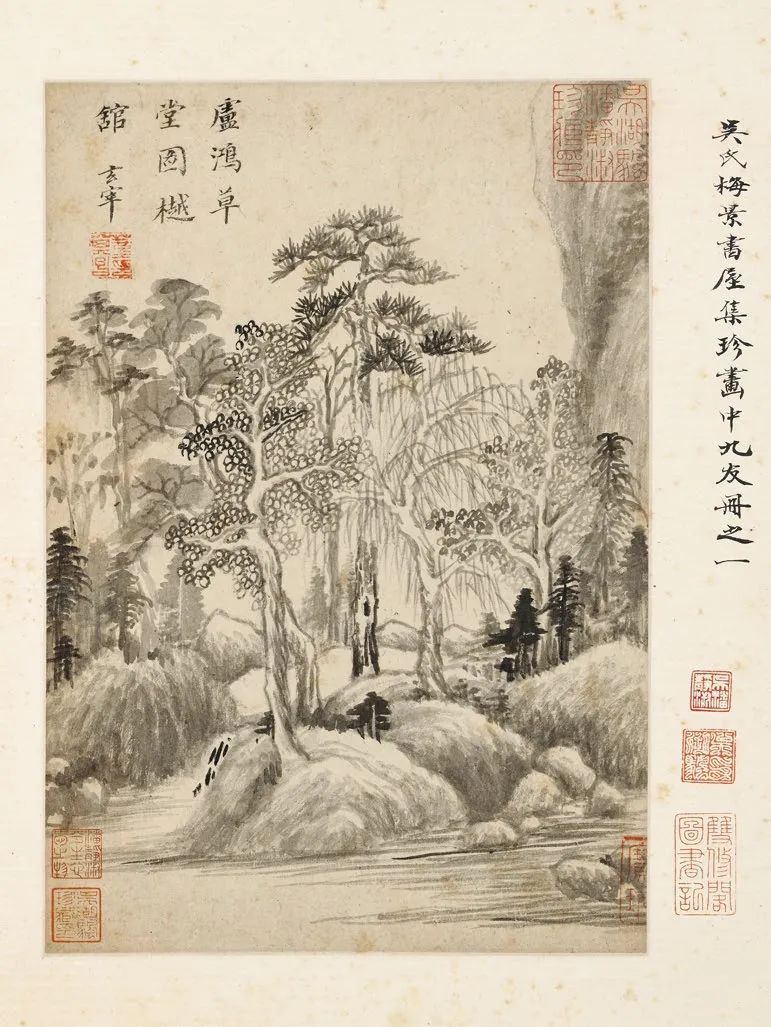 梅村(吴大业)《画中九友歌》董文敏居首列。余近岁所集九友画册,凡每家一本,圭臬都相若,多寡则不一,多至十二番,少则六七帧。并几而不雅,深自心喜,而格调则都自文敏分拨也。此为九友中第一本,适得文敏画象,因置于首帙。聊志仰景尔。