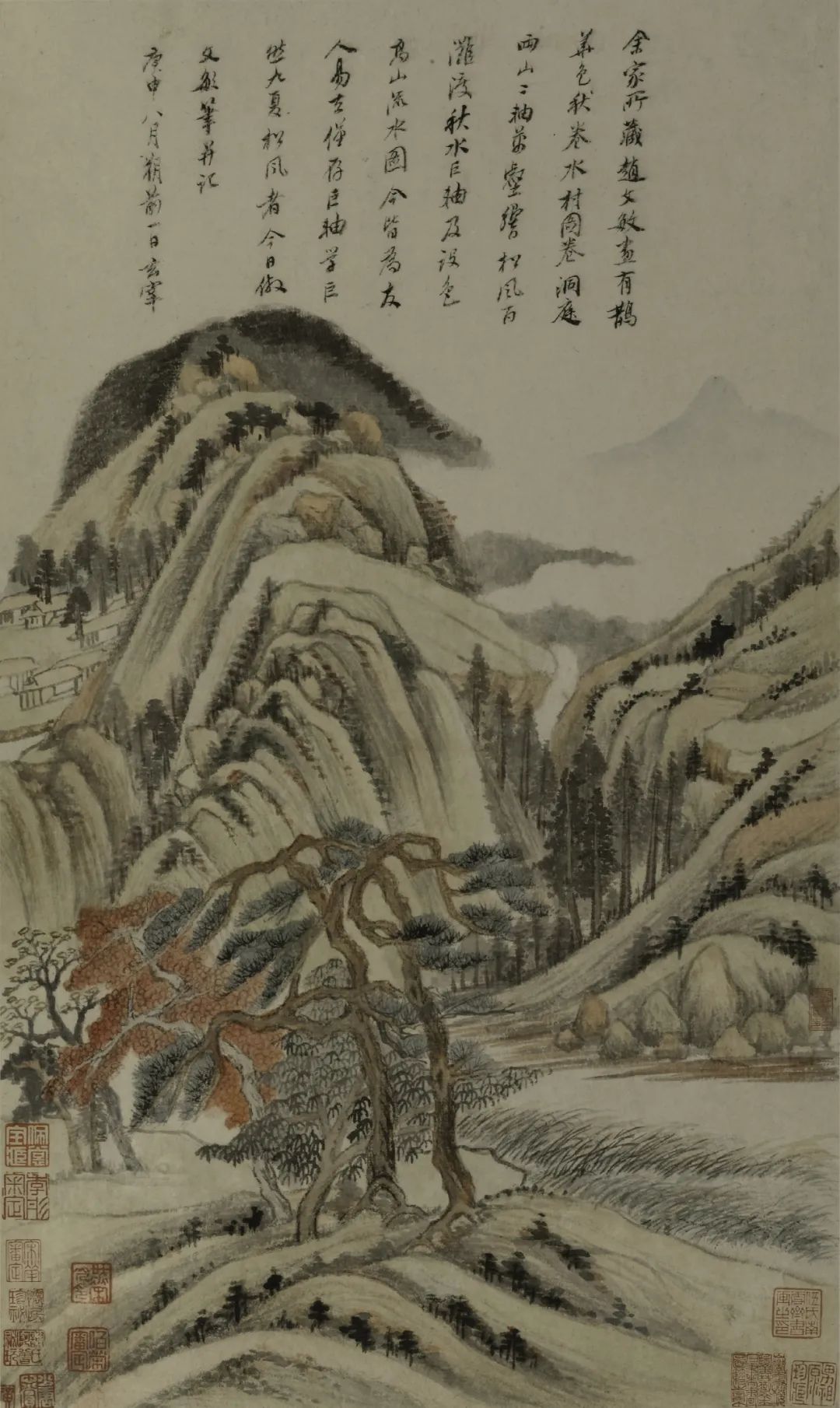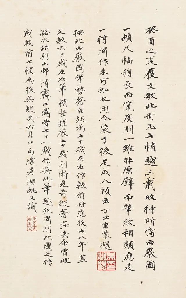 按,此《西岩图》笔势苍古,疑为七十岁傍边作,较前册应后七八年。盖文敏六十岁傍边笔,精整谨严,七十岁则渐见奇纵渺茫矣。余曾收《潞水话别》《山村清霁》二图,都七十一岁作,与此笔趣殊同,则此图之作或较前七帧为后无疑矣。六月中旬遣暑。湖帆又识。
