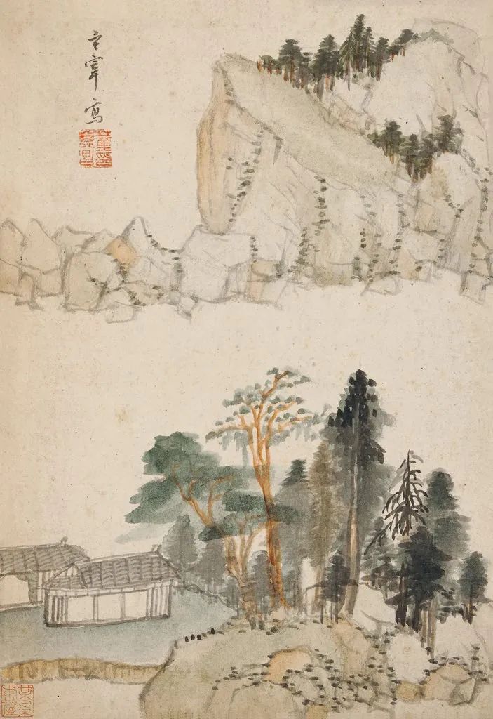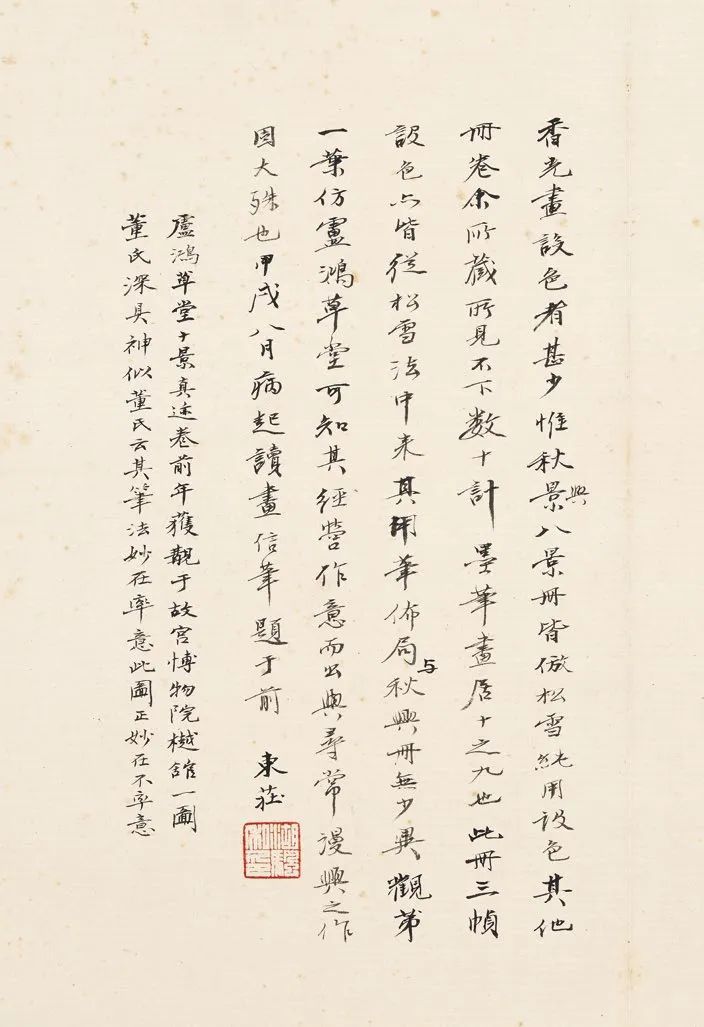 香光画,设色者甚少,惟《秋兴八景册》都仿松雪(赵孟頫),纯用设色。其他册卷,余所藏所见不下数十计,墨笔画居十之九也。此册三帧设色,亦都从松雪法中来,其用笔布局,与秋兴册无少异。不雅第一叶仿卢鸿草堂,可知其计较作意而出,与寻常漫兴之作,固大殊也。甲戌(1934)八月病起读画,信笔题于前。东庄。