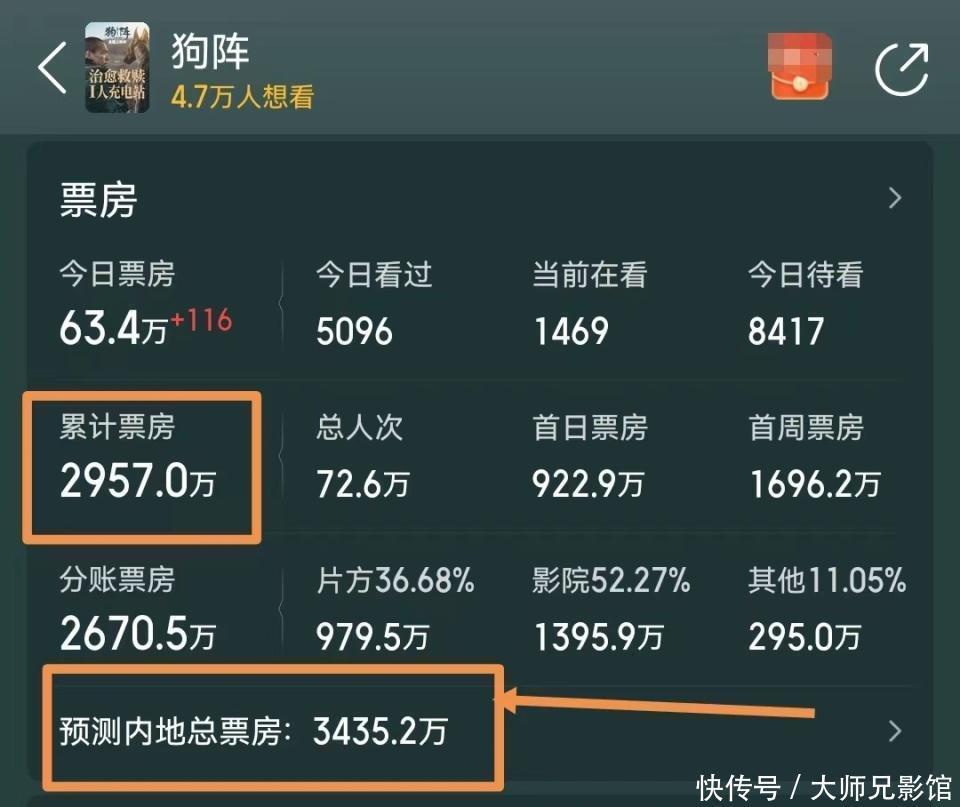 收场发稿时,上映八天的《狗阵》总票房仅收2957万,瞻望票房也只须3400万,有媒体报说念,此片的预算资本为1亿,院线回本为3亿。